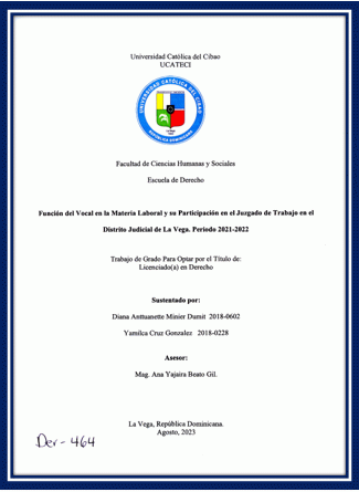 Función del vocal en la materia laboral y su participación en el juzgado de trabajo en el Distrito Judicial de La Vega. Periodo 2021-2022 / Diana Anttfuanette Minier Dumit, Cruz González Yamilca; asesor Ana Yajaira Beato Gil