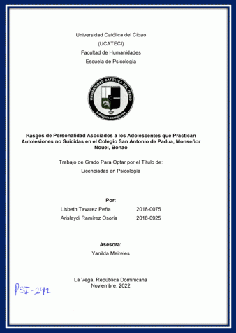 Rasgo de personalidad asociados a los adolescentes que practican autolesiones no suicidas en el Colegio San Antonio de Pauda, Monseñor Nouel, Bonao / Lisbeth Tavarez Peña, Arisleydi Ramirez Osoria; asesor Yanilda Meireles