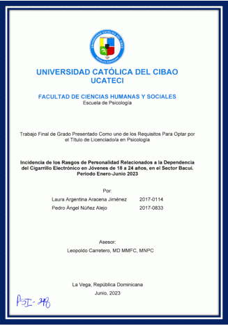 Incidencia de los rasgos de personalidad relacionados a la dependencia del cigarrillo electrónico en jovenes de 18 a 24 años en el sector de Bacuí. periodo enero-junio 2023 / Laura Argentina Aracena Jiménez, Pedro Ángel Núñez Alejo; Leopoldo Carretero