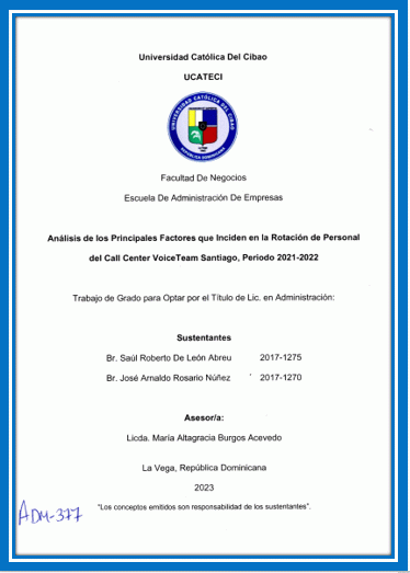 Análisis de los principales factores que inciden en la rotación de personal de Call Center Voice Team Santiago, periodo 2021-2022 / Saúl Roberto De León Abreu, José Arnaldo Rosario Núñez; asesor María Altagracia Burgos Acevedo