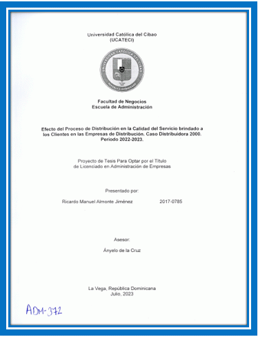 Efecto del proceso de distribución en la calidad del servicio brindado a los clientes en las empresas de distribución. Caso: Distribuidora 2000. Periodo 2022-2023 / Ricardo Manuel Almonte Jiménez, asesor Anyelo De la Cruz