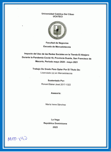 Impacto del uso de las redes sociales en la tienda El Abejero durante la pandemia covid-19, Provincia Duarte, San Francisco de Macorís, periodo mayo 2020-mayo 2021 / Ronard Baker José; asesor María Irene Sánchez