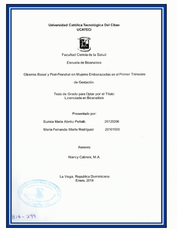 Glicemia basal y post - prandial en mujeres embarazadas en el primer trimestre de gestación / Eunice María Abreu Peñaló, María Fernanda Marte Rodríguez; asesor Nency Cabrera