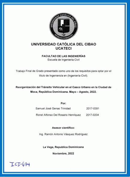 Reorganización del tránsito vehicular en el casco urbano en la ciudad de Moca, República Dominicana. Mayo-Agosto, 2022 / Samuel José Genao Trinidad, Ronel Alfonso Del Rosario Henríquez: asesor Ramón Antonio Vásquez Rodríguez