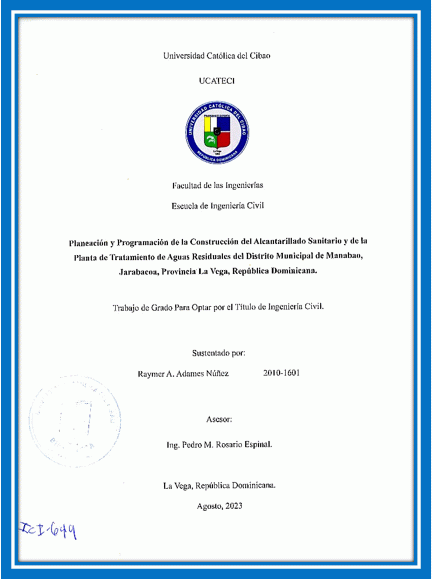 Planeación de la construcción del alcantarillado sanitario y de la planta de tratamiento de aguas residuales del Distrito Muncipal de Manabao, Jarabacoa, Provincia La Vega, República Dominicana / Raymer A. Adames Núñez; asesor Pedro M. Rosario Espinal