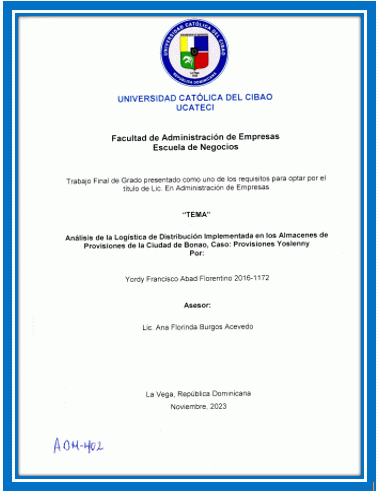 Análisis de la logística de distribución implementada en los almacenes de provisiones de la ciudad de Bonao, Caso: Provisiones Yoslenny / Yordy Francisco Abad Florentino; asesor Ana Florinda Burgos Acevedo
