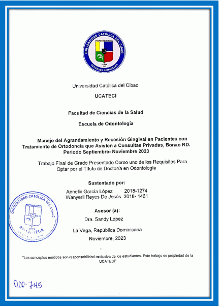 Manejo del agrandamieto y recesión gingival en pacientes con tratamiento de ortodoncia que asisten a consultas privadas, Bonao RD. periodo septiembre-noviembre 2023 / Annelix García López, Wanyerli Reyes De Jesús; asesor Sandy López