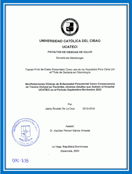 Manifestaciones clínicas de enfermedad periodontal como consecuencia de trauma oclusal en pacientes jóvenes-adultos que asisten al Hospital UCATECI en el período septiembre-noviembre 2023 / Jeimy Rosario De La Cruz; asesor Aquitani Pavlovi Garcia Almonte