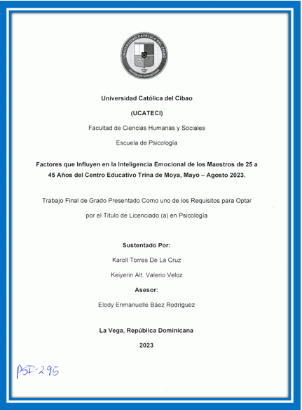 Factores que influyen en la inteligencia emocional de los maestros de 25 a 45 años del Centro Educativo Trina de Moya, mayo-agosto 2023 / Karoll Torres de la Cruz, Keiyerin Alt. Valerio Veloz; asesor Elody Enmanuelle Baez Rodríguez