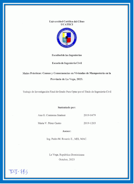 Malas prácticas: Causas y consecuencias en viviendas de mampostería en la provincia de La Vega, 2023 / Ana G. Contreras Jiménez, María V. Pérez Castro; asesor Pedro Manuel Rosario Espinal