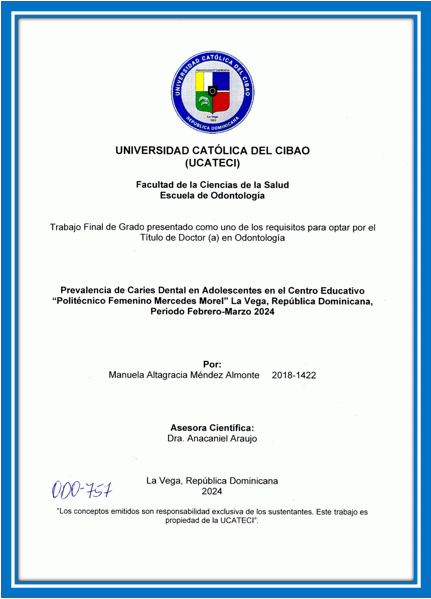 Prevalencia de caries dental en adolescentes en el Centro Educativo "Politécnico Femenino Mercedes Morel" La Vega, República Dominicana, periodo febrero-marzo 2024 / Manuela Altagracia Méndez Almonte; asesor Anacaniel Araujo