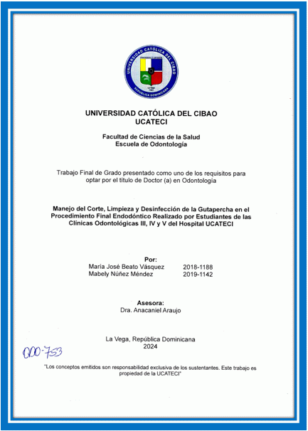 Manejo del corte, limpieza y desinfección de Guttapercha en el procedimiento final endodóntico realizado por estudiantes de las Clínicas Odontológicas III, IV y V del Hospital de UCATECI / María José Beato Vásquez, Mabely Ñúñez Méndez; asesor Anacaniel Araujo