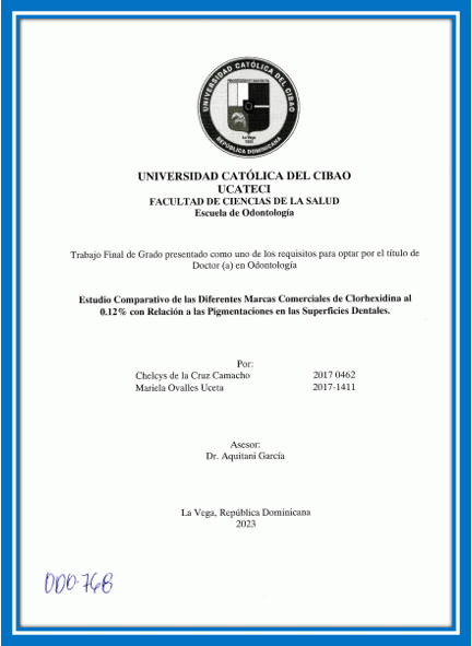 Estudio comparativo de las diferentes marcas comerciales de Clorhexidina al 0.12% con relación a las pigmentaciones en las superficies dentales / Chelcys de la Cruz Camacho, Mariela Ovalles Uceta; asesor Aquitani García