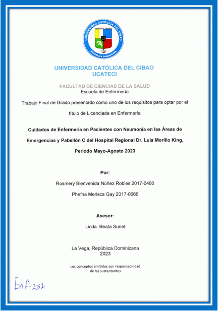 Cuidados de enfermería en pacientes con neumonía en las áreas de emergencias y Pabellón C del Hospital Regional Dr. Luis Morillo King, periodo mayo-agosto 2023 / Rosmery Bienvenida Núñez Robles, Phefna Merisca Gay; asesor Beata Suriel