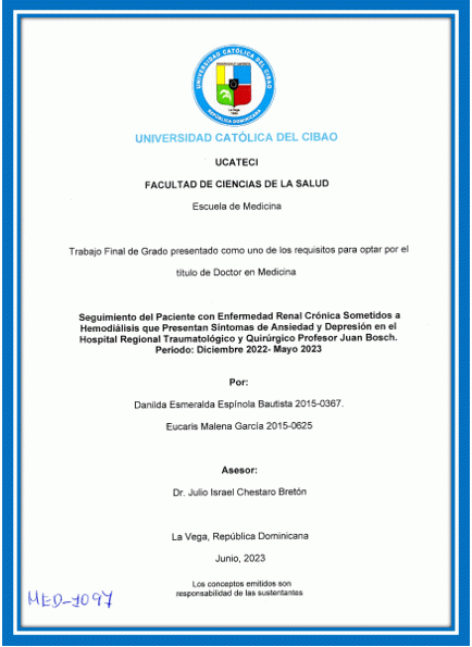Seguimiento del paciente con efermedad renal crónica sometidos a hemodiálisis que presentan síntomas de ansiedad y depresión en el Hospital Regional Traumatológico y Quirúrgico Profesor Juan Bosch. Periodo: diciembre 2022- mayo 2023 / Danilda Esmeralda Espínola Bautista, Eucaris Malena García; asesor Julio Israel Chestaro Bretón