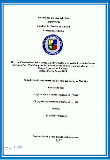 Nivel de conocimiento sobre métodos de prevención y detección precoz de cáncer de mama pre y post campaña de concientización en mujeres que laboran en el Colegio Agustiniano. La Vega. Período marzo-agosto 2023 / Angélica María Ramírez Henríquez, Giraldy Gessalyn Hernández García; asesor Marielys Martínez