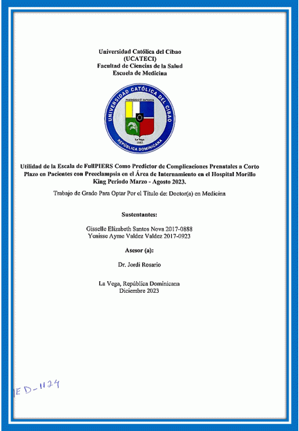 Utilidad de la escala de FullPIERS como predictor de complicaciones prenatales a corto plazo en pacientes con preeclampsia en el área de internamiento en el Hospital Morillo King periodo marzo - agosto 2023 / Gisselle Elízabeth Santos Nova, Yenisse Ayme Valdez Valdez; asesor Jordi Rosario