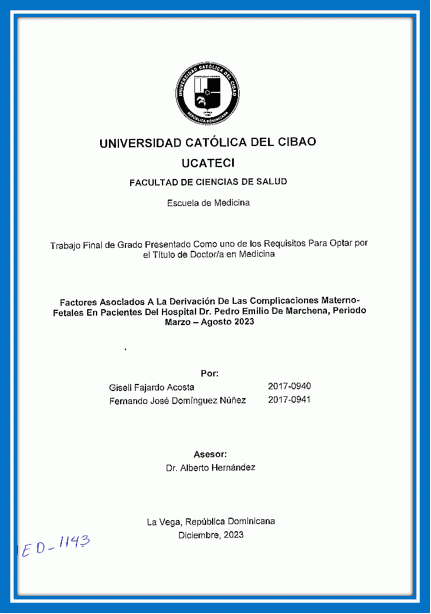 Factores asociados a la derivación de las complicaciones materno-fetales en pacientes del Hospital Dr. Pedro Emilio De Marchena, período Marzo-Agosto 2023 / Gisell Fajardo Acosta, Fernando José Domínguez Núñez; asesor Alberto Hernández