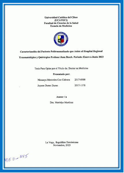 Caracterización del paciente politraumatizado que asiste al Hospital Regional Traumatológico y Quirúrgico Profesor Juan Bosch. Periodo: Enero a Junio 2023 / Nicaurys Mercedes Coo Cabrera, Jeyson Duran Duran; asesor Marielys Martínez