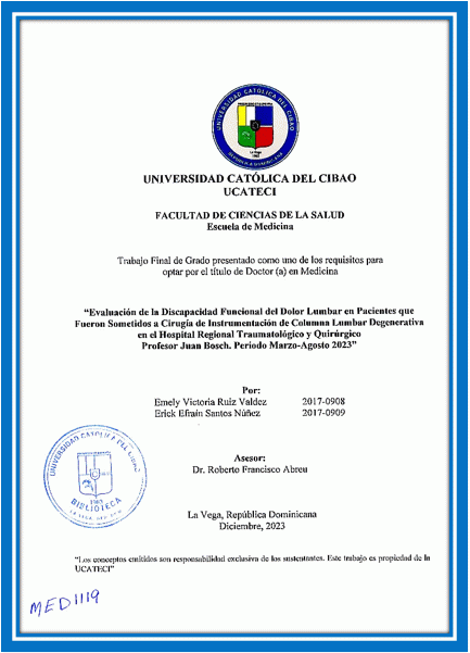 Evaluación de la discapacidad funcional del dolor lumbar en pacientes que fueron sometidos a cirugía de instrumentación de columna lumbar degenerativa en el Hospital Regional Traumatológico y Quirúrgico Profesor Juan Bosch. Periodo Marzo-Agosto 2023 / Emely Victoria Ruiz Valdez, Erick Efraín Santos Núñez; asesor Roberto Francisco Abreu