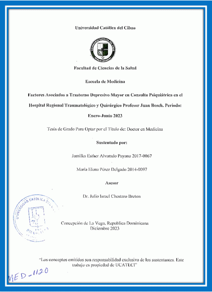 Factores asociados a trastorno depresivo mayor en consulta psiquiátrica en el Hospital Regional Traumatológico y Quirúrgico Profesor Juan Bosch. Periodo: Enero-Junio 2023 / Jamilka Esther Alvarado Payano, María Elena Pérez Delgado; asesor Julio Israel Chestaro Bretón