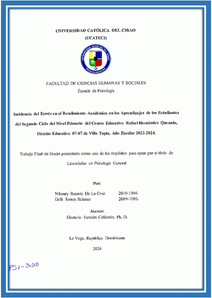 Incidencia del estrés en el rendimiento académico en los aprendizajes de los estudiantes del segundo ciclo del nivel primario del Centro Educativo Rafael Hernández Quezada, Distrito educativo 07-07 de Villa Tapia, año escolar 2023-2024 / Nikaury Rosario de la Cruz, Delfi Torres Reinoso; asesor Eleuterio Ferreira Calderón