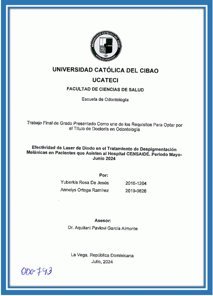 Efectividad de laser de diodo en el tratamiento de despigmentación melánicas en pacientes que asisten al Hospital CENSAIDE. Período mayo-junio 2024 / Yuberkis Rosa de Jesús, Annelys Ortega Ramírez; asesor Aquitani Pavlovi Garcia Almonte