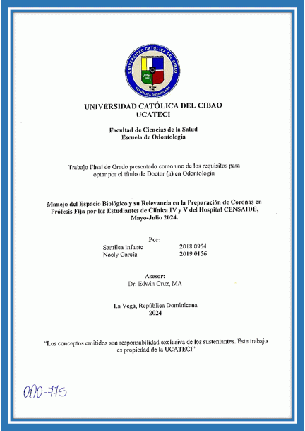 Manejo del espacio biológico y su relevancia en la preparación de coronas en prótesis fija por los estudiantes de Clínica IV y V del Hospital CENSAIDE, mayo-julio 2024 / Samilca Infante, Noely García; asesor Edwin Cruz