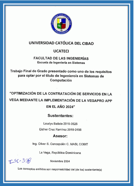 Optimización de la contratación de servicios en La Vega mediante la implementación de la Vegapro App en el año 2024 / Leudys Batista, Eidher Cruz Ramirez; asesor Oliver S. Concepción C.