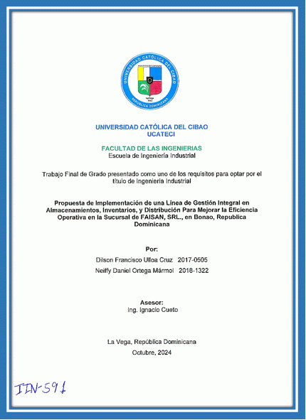 Propuesta de implementación de una línea de gestión integral en almacenamientos, inventarios y distribución para mejorar la eficiencia operativa en la sucursal de FAISAN, SRL., en Bonao, República Dominicana / Dilson Francisco Ulloa Cruz, Neiffy Daniel Ortega Mármol; asesor Ignacio Cueto