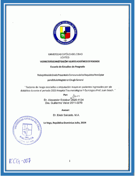 Factores de riesgo asociados a amputación mayor en pacientes ingresados por pie diabético durante el periodo 2023 Hospital Traumatológico y Quirúrgico Prof. Juan Bosch / Alexander Esteban Contreras, Guillermo Veloz; asesor Erick Salcedo