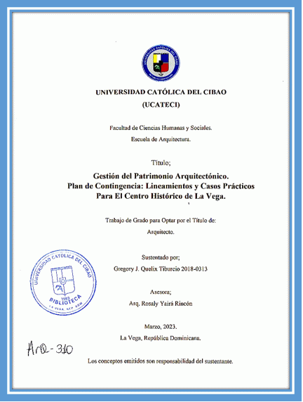 Gestión del patrimonio arquitectónico. Plan de contingencia: Lineamientos y casos prácticos para el centro histórico de La Vega / Gregory J. Quelix Tiburcio; asesor Rosaly Yairá Rincón