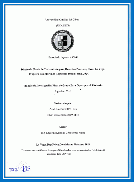 Diseño de planta de tratamiento para desechos porcinos, Caso: La Vega, proyecto Las Martínez, República Dominicana, 2024 / Ariel Jiménez, Elvin Concepción; asesor Edgarkis Dariniel Crisóstomo Marte