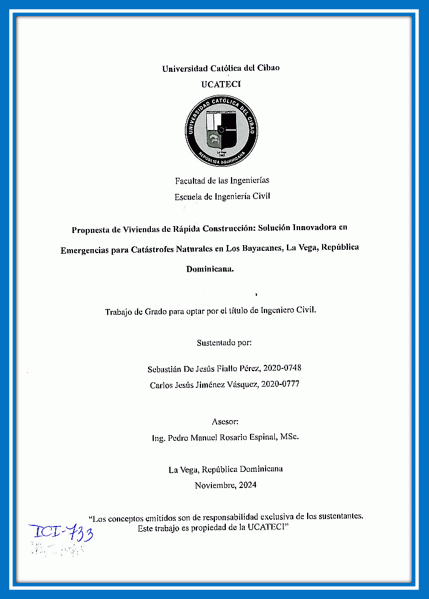 Propuesta de viviendas de rápida construcción: Solución innovadora en emergencias para catástrofes naturales en Los Bayacanes, La Vega, República Dominicana / Sebastian De Jesus Fiallo Perez, Carlos Jesús Jiménez Vásquez; asesor Pedro Manuel Rosario Espinal
