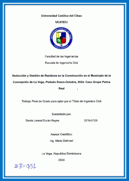 Reducción y gestión de residuos en la construcción en el Municipio de la Concepción de La Vega, Periodo enero-octubre, 2024. Caso Grupo Palma Real / Dante Leonel Durán Reyes; asesor Mario Dalmasi