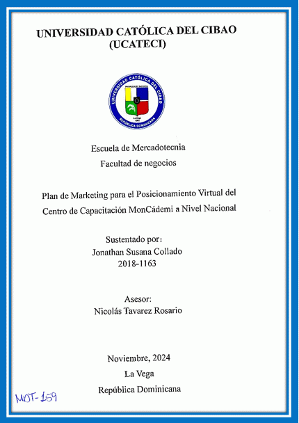 Plan de marketing para el posicionamiento virtual del Centro de Capacitación MonCádemi a Nivel Nacional / Jonathan Susana Collado; asesor Nicolás Távarez Rosario