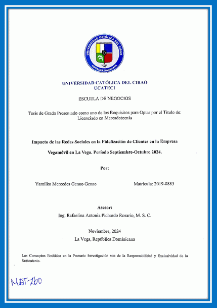 Impacto de las redes sociales en la fidelización de clientes en la Empresa Vegamóvil en La Vega. Período septiembre-octubre 2024 / Yamilka Mercedes Genao Genao; asesor Rafaelina Antonia Pichardo Rosario