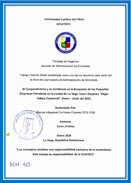 El cooperativismo y su incidencia en la economía de las pequeñas empresas ferreteras en la ciudad de La Vega. Caso: Empresa "Eligio Valdez Comercial", enero-junio del 2023 / Blasina Altagracia Contreras Cáceres; asesor Sonia Jiménez