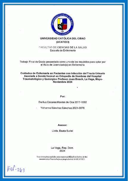 Cuidados de enfermería en pacientes con infección del tracto urinario asociada a sonda vesical en ortopedia de hombres del Hospital Traumatológico y Quirúrgico Profesor Juan Bosch, La Vega, mayo-noviembre 2024 / Dariluz Cáceres Montes de Oca, Yohanna Sánchez Sánchez; asesor Beata Suriel