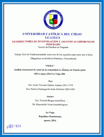 Análisis situacional de salud de la comunidad La Sabana de Pontón junio 2023 a mayo 2024 La Vega, República Dominicana / Gisell Yolanda Paulino Adames, Patricia Dominga De Jesús Medrano; asesores Victoria Burgos, Bienvenido Veras