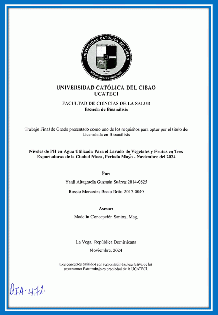 Niveles de PH en agua utilizada para el lavado de vegetales y frutas en tres exportadoras de la ciudad Moca, Periodo mayo-noviembre del 2024 / Yanil Altagracia Guzmán Suárez, Rossio Mercedes Beato Brito; asesor Madelin Concepción Santos