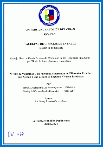 Niveles de vitaminas D en personas hipertensas en diferentes estadios que asistan a una Clínica de Segundo Nivel en Jarabacoa / Jasmin Altagracia de los Santos Quezada, Suleiny del Carmen Peralta Fernández; asesor Nancy Ramona Cabrera Sosa