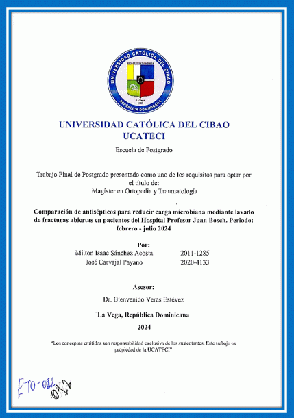 Comparación de antisépticos para reducir carga microbiana mediante lavado de fracturas abiertas en pacientes del Hospital Profesor Juan Bosch. Periodo: Febrero-julio 2024 / Milton Isaac Sánchez Acosta, José Carvajal Payano; asesor Bienvenido Veras Estévez