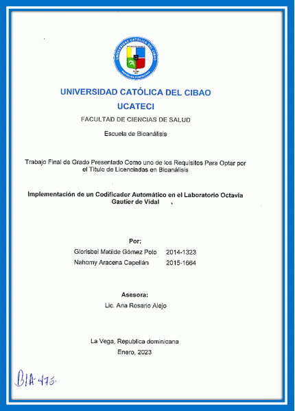 Implemntación de un codificador automático en el Laboratorio Octavia Gautier de Vidal / Glorisbel Matilde Gómez Polo, Nahomy Aracena Capellán; asesor Ana Rosario Alejo