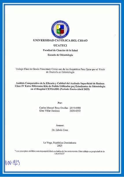 Análisis comparativo de la eficacia y calidad del acabado superficial de resinas clase IV entre diferentes kits de pulido utilizados por estudiantes de odontología en el Hospital CENSAIDE (Período enero-abril 2025) / Carlos Manuel Brea Ovalles, Gina Villar Jiménez; asesor Edwin Cruz