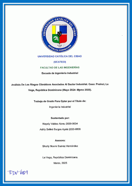 Análisis de los riesgos climáticos asociados al sector industrial. Caso: Proinci, La Vega, República Dominicana (mayo 2024-marzo 2025) / Nayely Valdez Abreu, Ashly Seliné Burgos Ayala; asesor Sherly Noemi Suárez Hernández