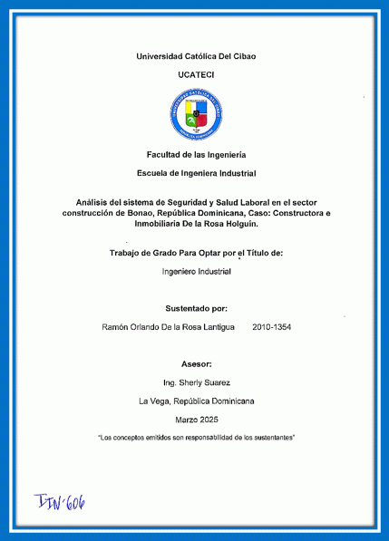Análisis del sistema de seguridad y salud laboral en el sector construcción de Bonao, República Dominicana, Caso: Constructora e Inmobiliaria De La Rosa Holguín / Ramón Orlando de la Rosa Lantigua; asesor Sherly Suarez