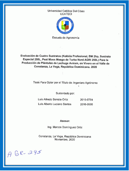 Evaluación de cuatro sustratos (Kekkila Profesional, BM 2hp, Sustrato Especial 250L, Peat Moss Musgo de Turba Nord AGRI 250L) para la producción de plántulas de Lechuga Aviram, en vivero en el Valle de Constanza, La Vega, República Dominicana 2020 / Luis Alfredo Serrata Ortiz, Luis Alberto Luciano Santos; asesor Marcos Domínguez Ortiz