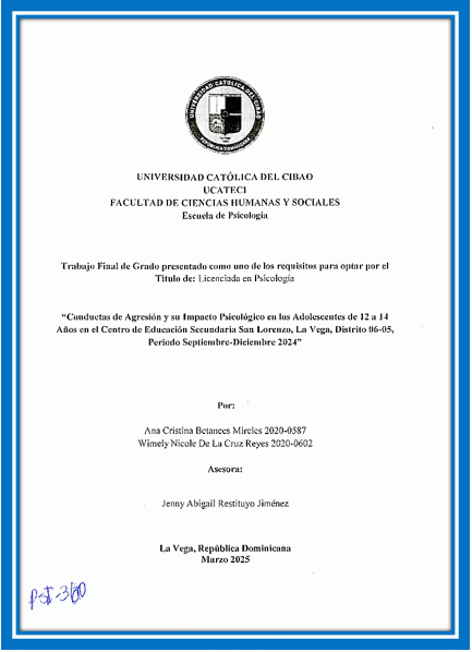 Conductas de agresión y su psicológico en los adolescentes de 12 a 14 años en el Centro de Educación Secundaria San Lorenzo, La Vega, Distrito 06-05, periodo septiembre-diciembre 2024 / Ana Cristina Betances Mireles, Wilmely Nicole De La Cruz Reyes; asesor Jenny Abigail Restituyo Jiménez