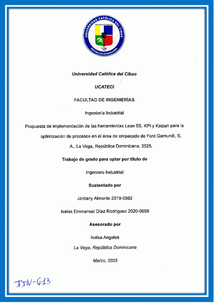 Propuesta de implementación de las herramientas Lean 5S, KPI y Kaizen para la optimización de procesos en el área de empacado de Font Gamundi, S.A., La Vega, República Dominicana, 2025 / Yordany Almonte, Isaías Emmanuel Díaz Rodríguez; asesor Iselsa Ángeles